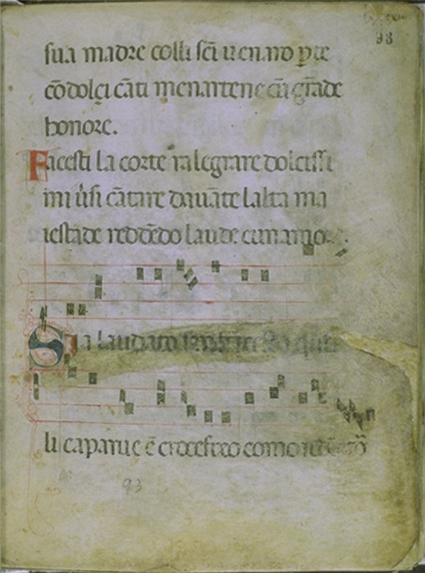 L’esigenza di una maggior perizia nelle esecuzioni e la finalità di uno scambio di repertorio tra le varie associazioni portarono a fare raccolta dei numerosi componimenti: d’altra parte, alla metà del Duecento, la lauda era ormai pervenuta alla sua forma definitiva, quella della ballata profana, dalla quale dovette trarre non poche movenze di ritmo e di carattere; ed era il momento migliore perché fosse elevata, anche attraverso la sua preservazione, da semplice canto devozionale di trasmissione orale a raffinato esempio della più spontanea arte popolare. Sorsero così i famosi laudari, che custodirono la memoria della lauda fino ai nostri giorni. Ma dei circa duecento giunti sino a noi, soltanto due contengono, oltre ai testi, anche le melodie, assumendo per questo un’importanza enorme: il codice 91 della biblioteca comunale dell’Accademia Etrusca di Cortona e il Magliabechiano II.I.122 della Biblioteca Nazionale di Firenze.*